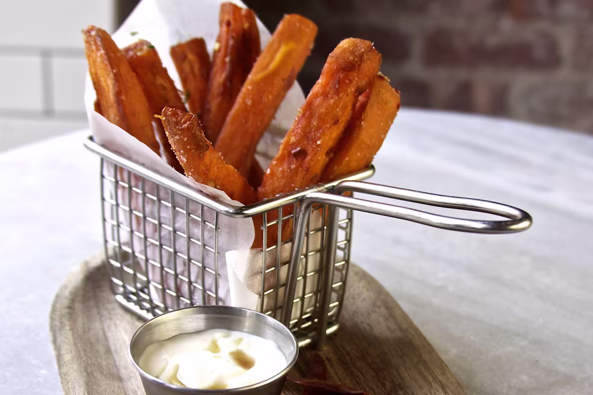 chilli roasted sweet potato friesCrispy sweet potato fries tossed in a delicious chili topping, served with a maple dipping sauce.